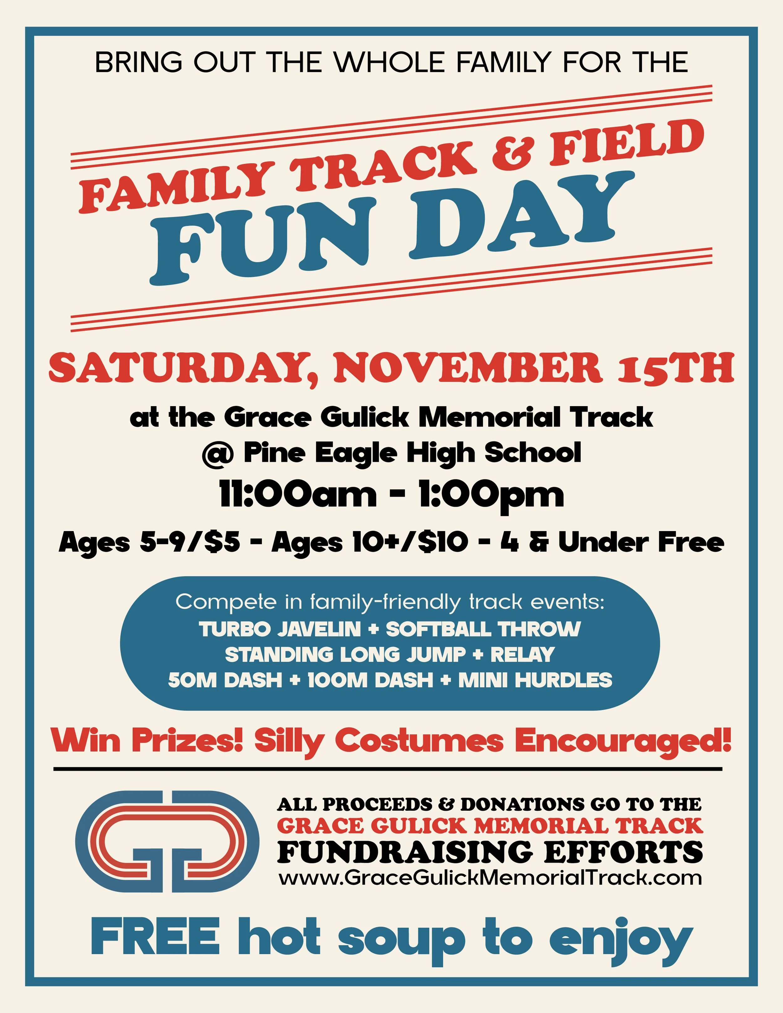 Come on out for the first track fundraiser for Grace Gulick Community Track! There will be a host of family-friendly track events along with prizes, a costume contest, and free hot soup. All proceeds will go towards funding the track project.